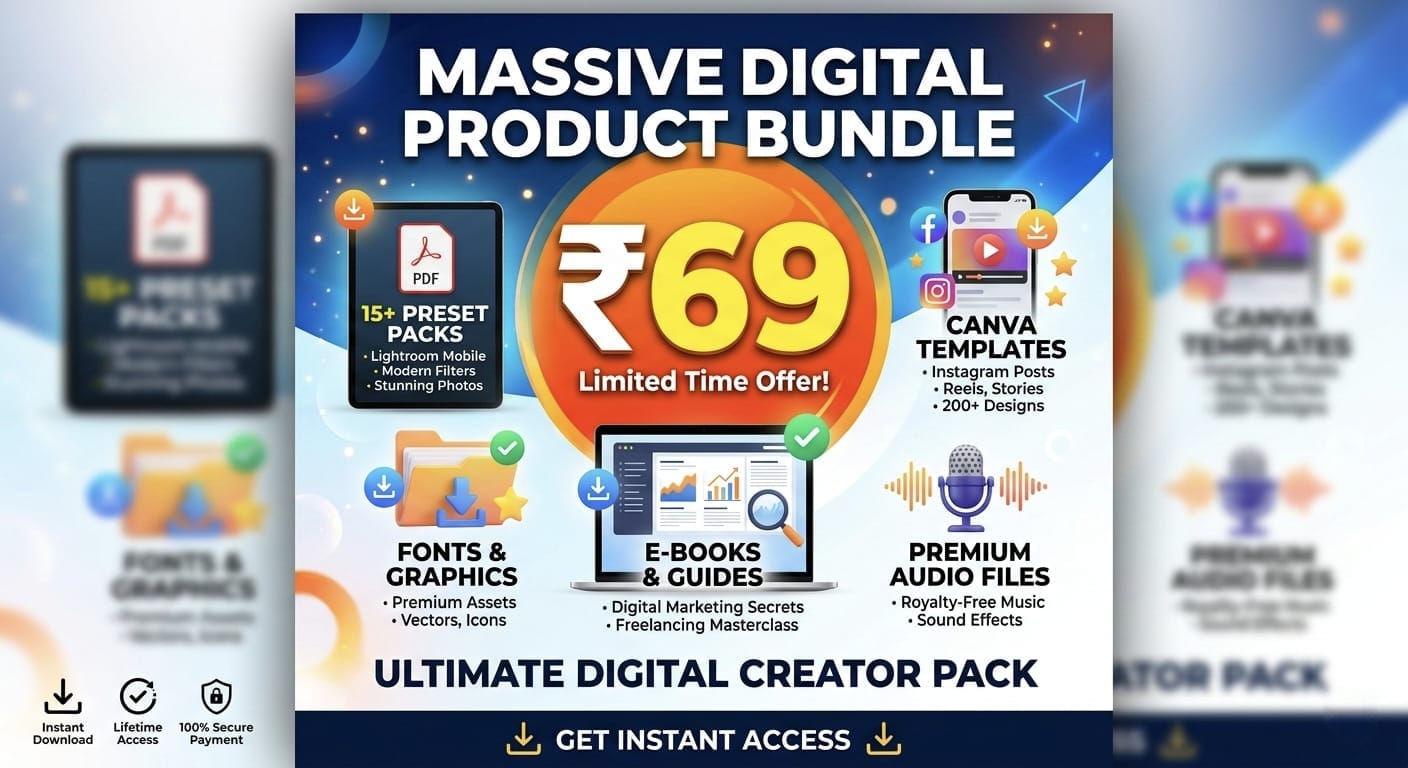 Get 18M+ Digital Products in one bundle for just ₹69. Includes resell rights, templates, tools and resources. Start your own digital store and set your own pricing. Results depend on your skills and effort